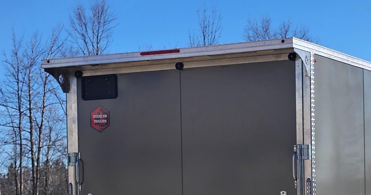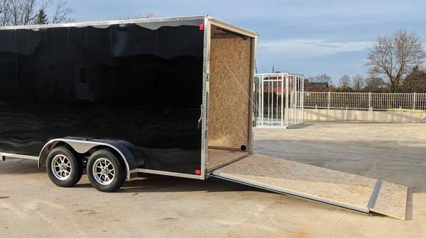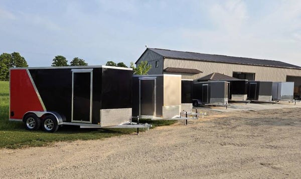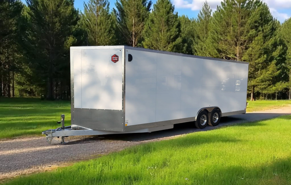 Tandem 3500lb or 5200lb 4" drop Both axles electric brakes 225 or 205 x 15 radial tires Aluminum wheels Triple tube A-frame tongue V-nose design 1.25" square tube box frame 2"x4" or 2"x6" tube floor frame 16" stud and joist spacing 30"x72" Side door 4 flip up D-rings Aluminum siding Aluminum fenders and trim Screwless exterior 24" stone guard 1pc aluminum roof Drymax interior LED lighting 7 prong plug 2000lb jack Interior lights 2 5/16" ball coupler